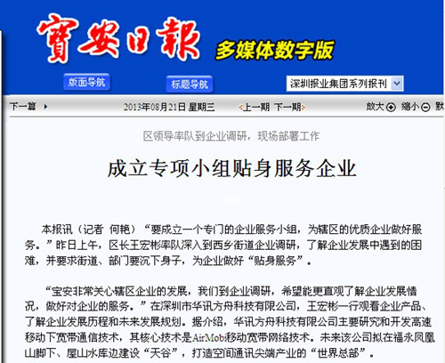 寶安區(qū)成立“華訊事務(wù)專項(xiàng)小組”,區(qū)長親任組長支持這家落戶寶安的先驅(qū)企業(yè)。該企業(yè)AirMobi技術(shù)解決了現(xiàn)在WIFI不能支持移動寬帶上網(wǎng),這一移動與帶寬沖突世界級技